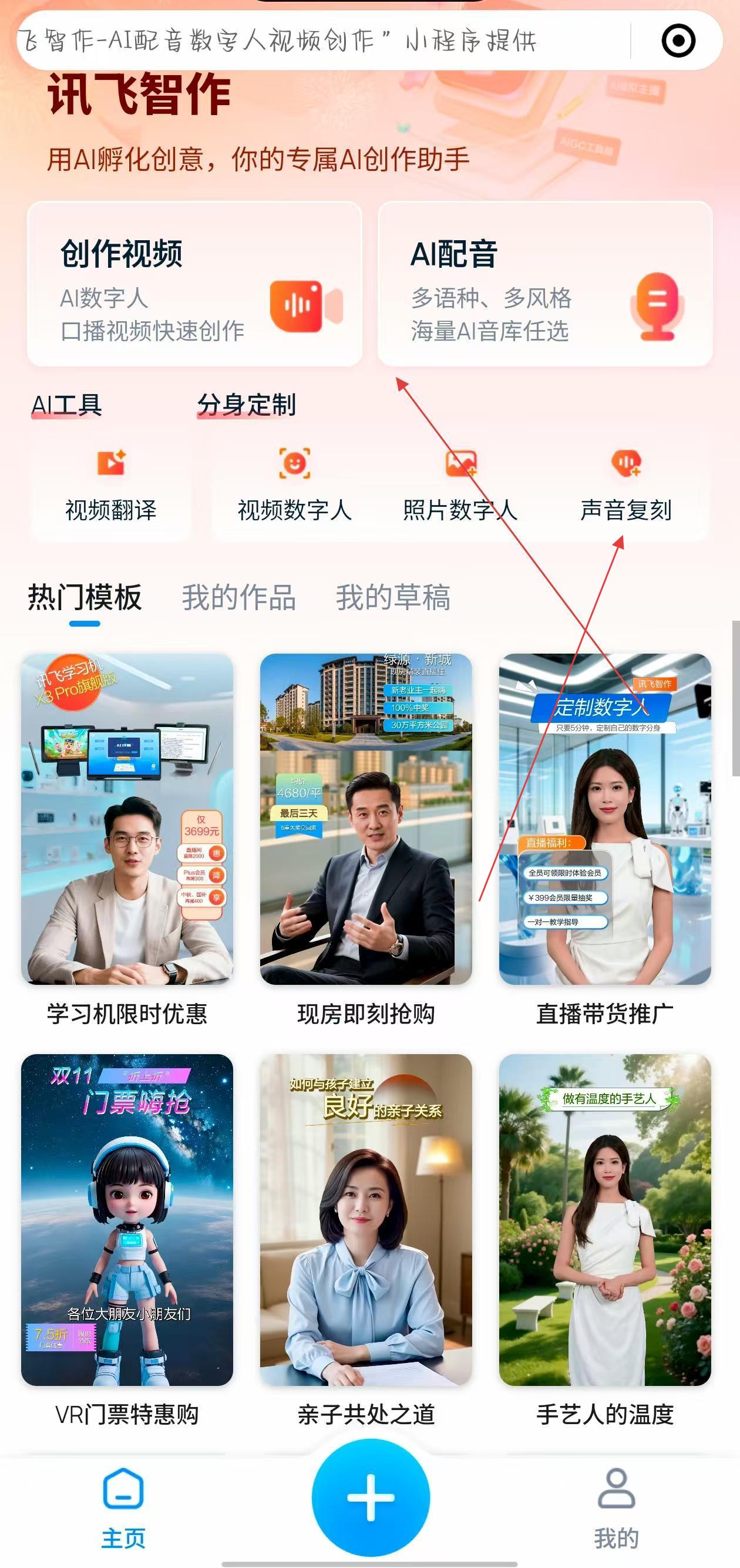 3、進(jìn)入訊飛智作小程序,點(diǎn)擊上方創(chuàng)作模塊或者在AI工具區(qū)找到聲音復(fù)刻功能,按照指引生成專(zhuān)屬AI聲音模型。