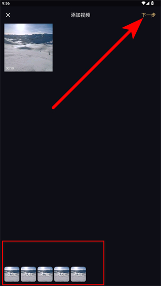 3、進(jìn)入添加視頻界面,選擇要編輯的視頻后,點(diǎn)擊右上角的下一步按鈕。