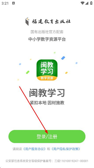 1、打開(kāi)閩教英語(yǔ)app,點(diǎn)擊頁(yè)面中的登錄/注冊(cè)按鈕。