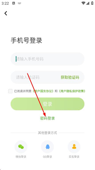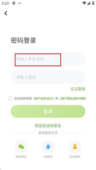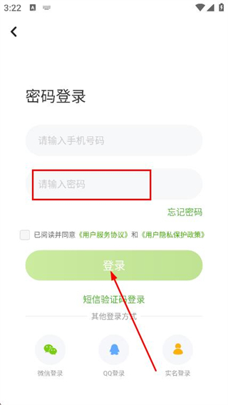 3、在密碼登錄頁(yè)面,填寫(xiě)注冊(cè)時(shí)使用的手機(jī)號(hào)碼。