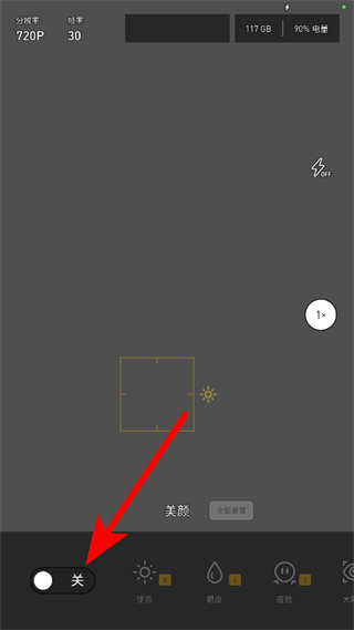 2、在美顏設(shè)置中開啟美顏開關(guān),準(zhǔn)備調(diào)整具體美顏效果。