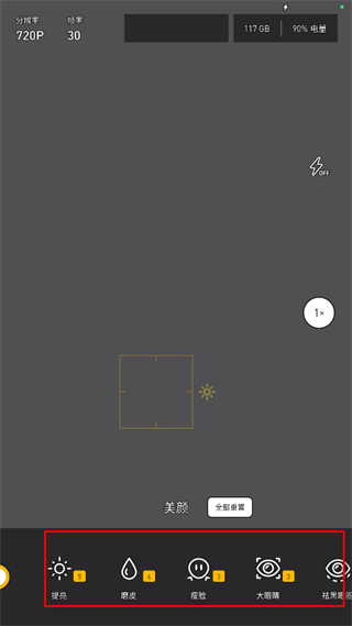 3、選擇喜歡的美顏功能如提亮、磨皮、瘦臉、大眼睛等,進(jìn)行參數(shù)調(diào)整。