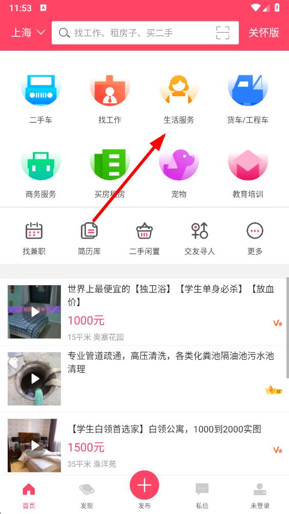 1、打開百姓網(wǎng)APP后,在首頁眾多功能圖標(biāo)中,找到并點(diǎn)擊生活服務(wù)選項(xiàng),進(jìn)入生活服務(wù)相關(guān)界面。