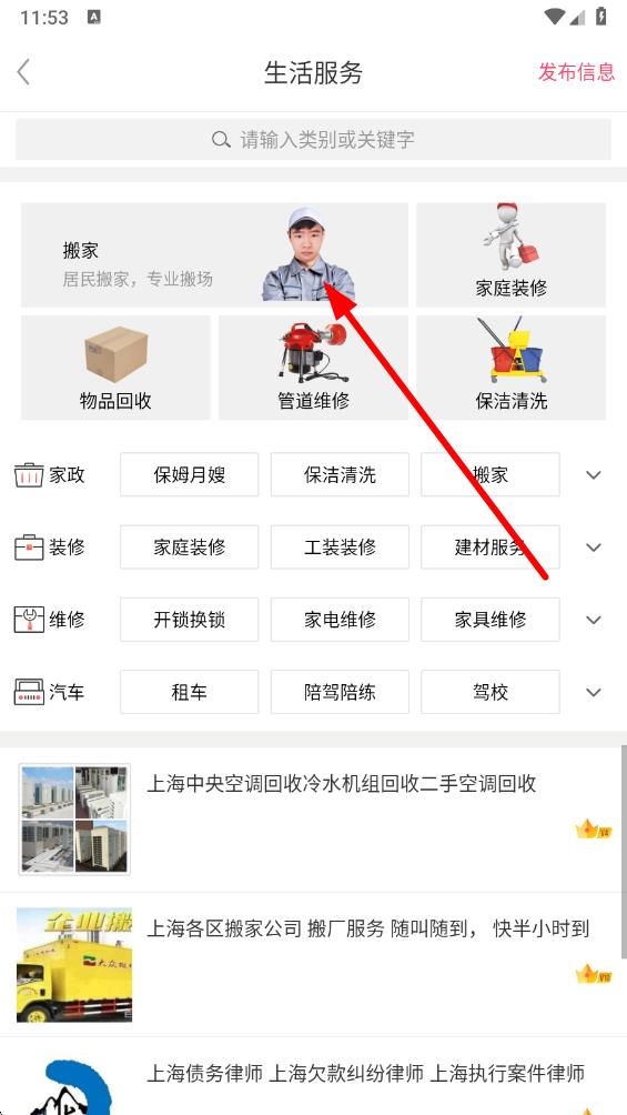 2、進(jìn)入生活服務(wù)界面后,在眾多服務(wù)類別中,點(diǎn)擊搬家圖標(biāo),進(jìn)入搬家服務(wù)頁面。