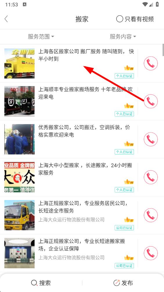 3、在搬家服務(wù)信息頁面,瀏覽各個(gè)搬家公司信息,選擇一家你認(rèn)為合適的搬家公司,點(diǎn)擊其對應(yīng)的服務(wù)條目。