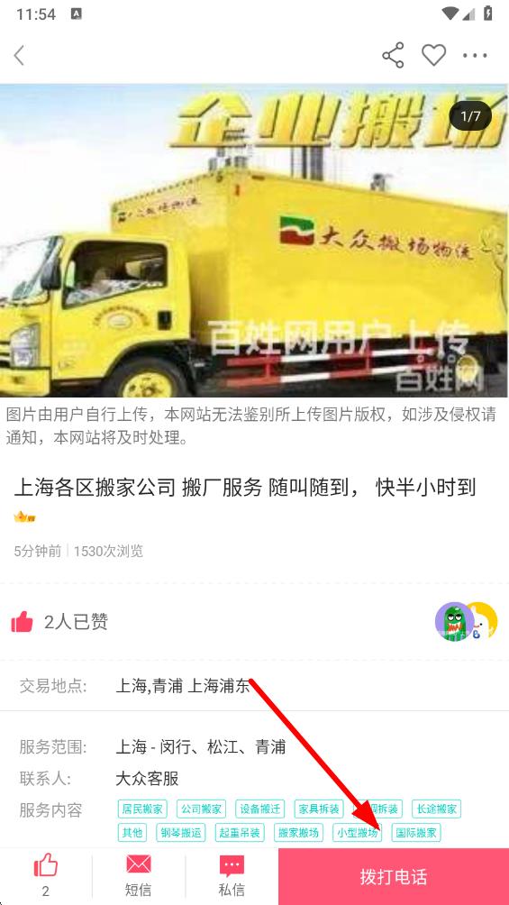 4、進(jìn)入詳情頁后,找到頁面中的撥打電話按鈕,點(diǎn)擊該按鈕,即可聯(lián)系對應(yīng)的搬家服務(wù)。