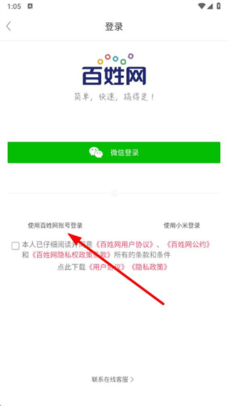 2、在登錄頁面點(diǎn)擊使用百姓網(wǎng)賬號登錄,進(jìn)入賬號登錄界面。
