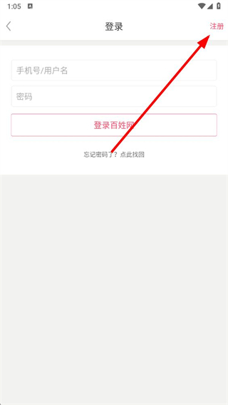 3、在賬號登錄界面點(diǎn)擊右上角注冊選項(xiàng),進(jìn)入加入百姓網(wǎng)頁面。