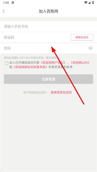 4、在加入百姓網(wǎng)頁面輸入手機(jī)號碼、驗(yàn)證碼和密碼,勾選同意協(xié)議后,即可完成賬號注冊。