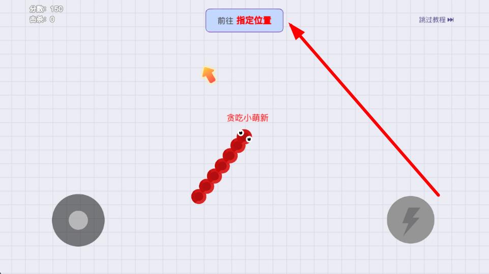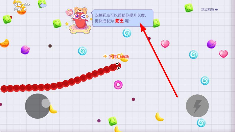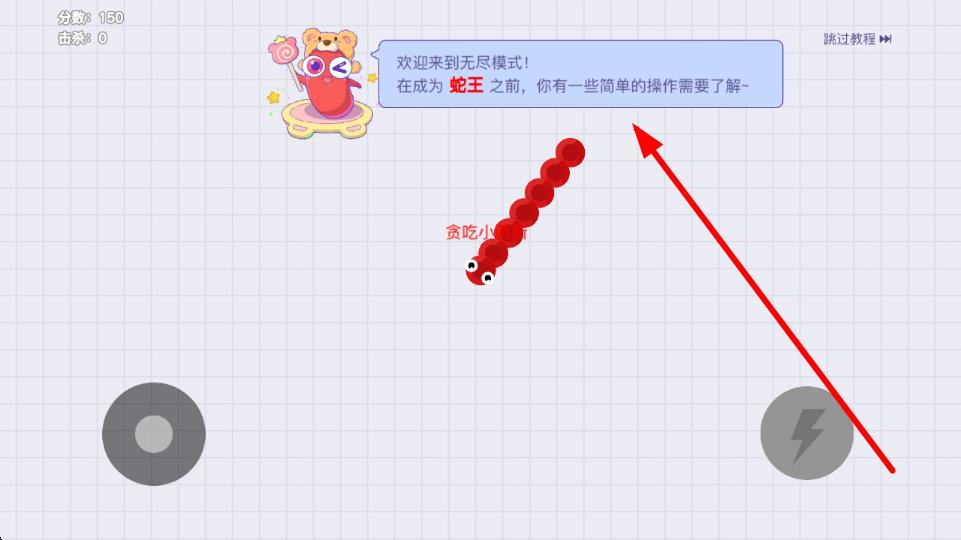 1、會(huì)收到提示,在成為蛇王之前,需要了解一些簡(jiǎn)單操作。此時(shí)先熟悉一下屏幕左下角的移動(dòng)搖桿和右下角的加速按鈕位置。