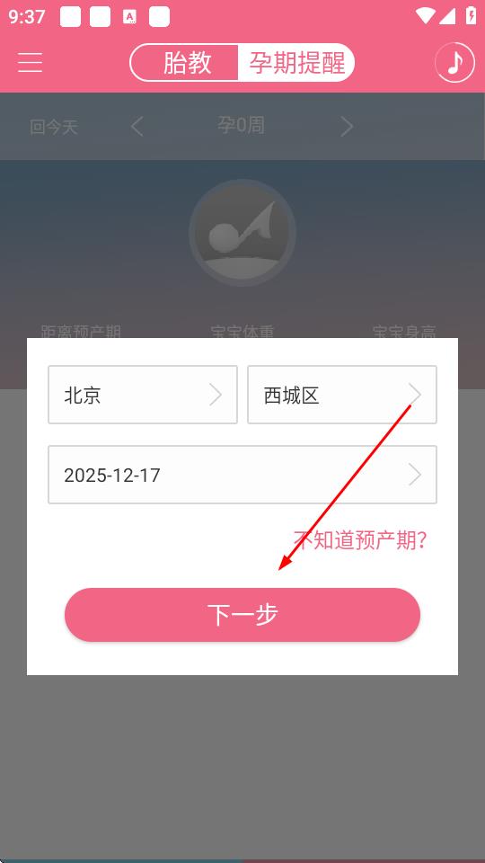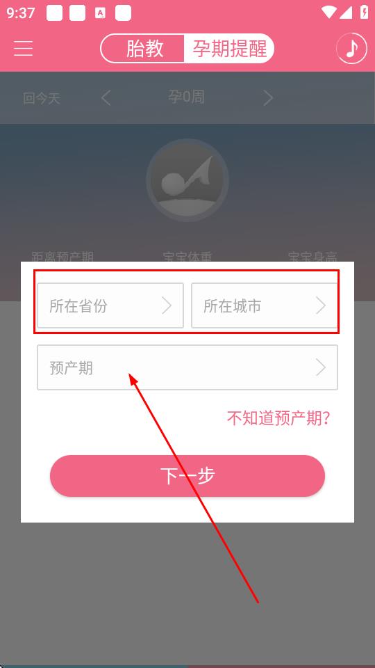 4、完成省份、城市和預(yù)產(chǎn)期設(shè)置后,點(diǎn)擊下一步。