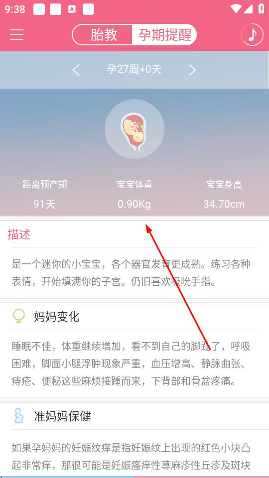 5、設(shè)置完成后,App會(huì)根據(jù)預(yù)產(chǎn)期自動(dòng)計(jì)算并顯示寶寶的天數(shù)等相關(guān)孕期信息。