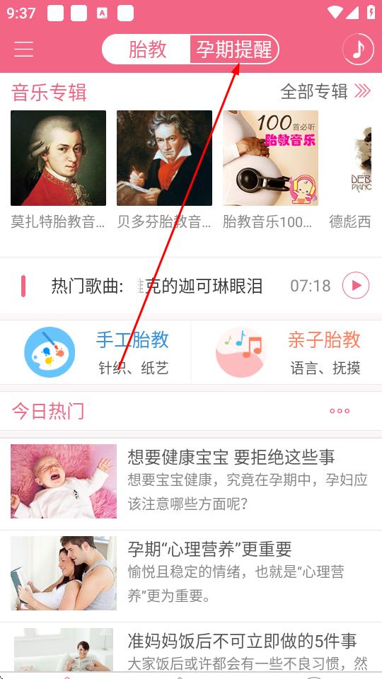1、打開胎教盒子App,點擊頂部的孕期提醒選項。