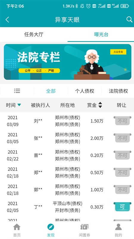 篩選功能,可以根據(jù)時間、賞金、所在地等條件進行篩選諸多失信人信息;