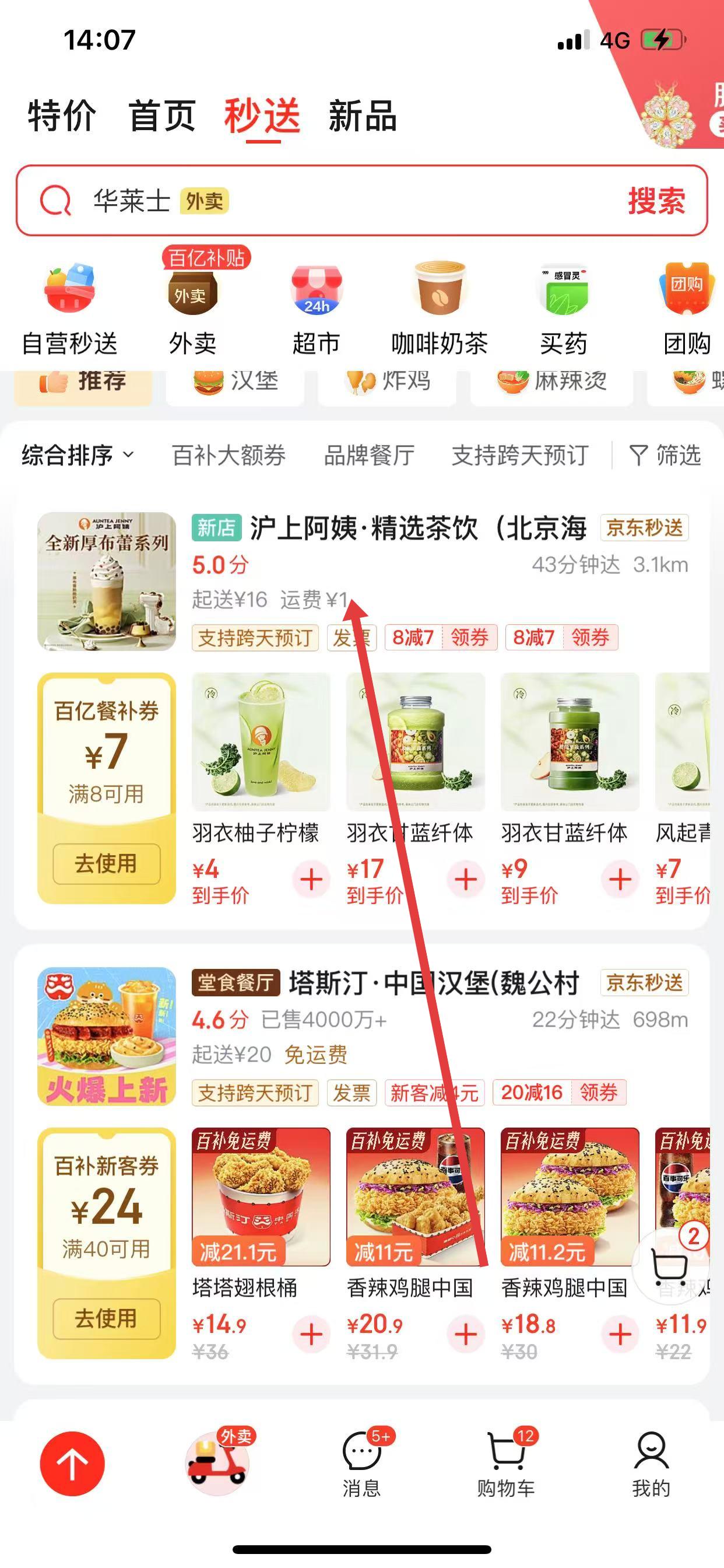 2、進入秒送頁面后,系統(tǒng)會根據(jù)定位,顯示附近的外賣商家和商品。
