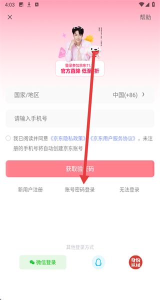 3、在進入到登錄頁面中,可以點擊下方賬號密碼登錄按鈕,切換登錄方式。