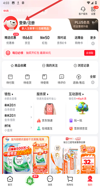 2、在個人中心頁面點擊“登錄/注冊”,進入登錄注冊頁面。