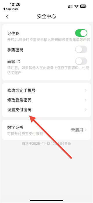 3、在安全中心頁(yè)面,點(diǎn)擊設(shè)置支付密碼選項(xiàng),進(jìn)入選擇驗(yàn)證方式頁(yè)面。