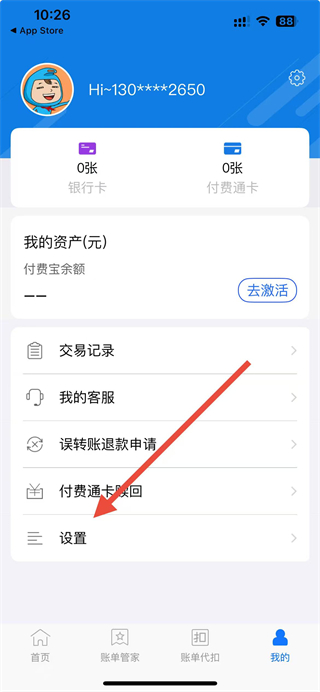 1、打開付費(fèi)通app,在我的頁(yè)面點(diǎn)擊設(shè)置選項(xiàng),進(jìn)入設(shè)置頁(yè)面。