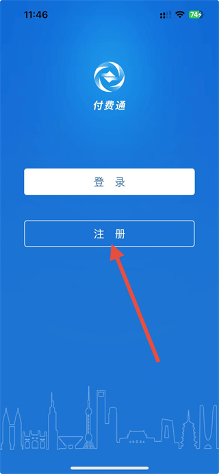 1、打開付費(fèi)通APP后,在首頁(yè)找到注冊(cè)按鈕并點(diǎn)擊。
