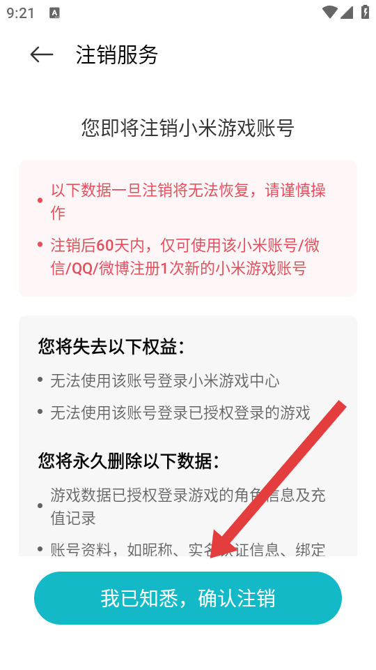4、在注銷(xiāo)服務(wù)頁(yè)面,仔細(xì)閱讀注銷(xiāo)提示后,點(diǎn)擊我已知悉,確認(rèn)注銷(xiāo)按鈕,完成賬號(hào)注銷(xiāo)操作。