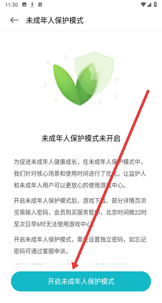 4、點(diǎn)擊“開(kāi)啟未成年人保護(hù)模式”按鈕,進(jìn)行開(kāi)啟操作。