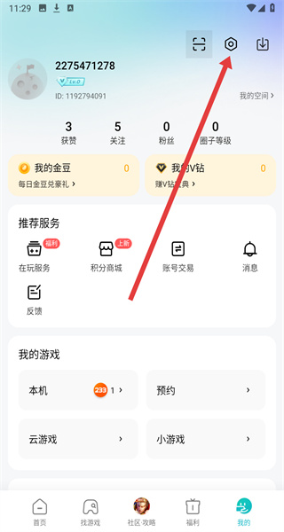 1、在游戲中心“我的”頁(yè)面點(diǎn)擊右上角設(shè)置圖標(biāo),進(jìn)入設(shè)置頁(yè)面。