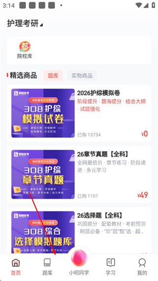 1、在昭昭醫(yī)考app的首頁(yè),點(diǎn)擊底部題庫(kù)選項(xiàng),進(jìn)入題庫(kù)頁(yè)面。