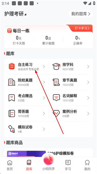 2、在題庫(kù)頁(yè)面點(diǎn)擊自主練習(xí)選項(xiàng),進(jìn)入自主練習(xí)設(shè)置頁(yè)面。