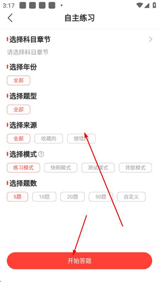 3、在自主練習(xí)頁(yè)面選擇科目章節(jié)、題型等參數(shù)后,點(diǎn)擊開(kāi)始答題。