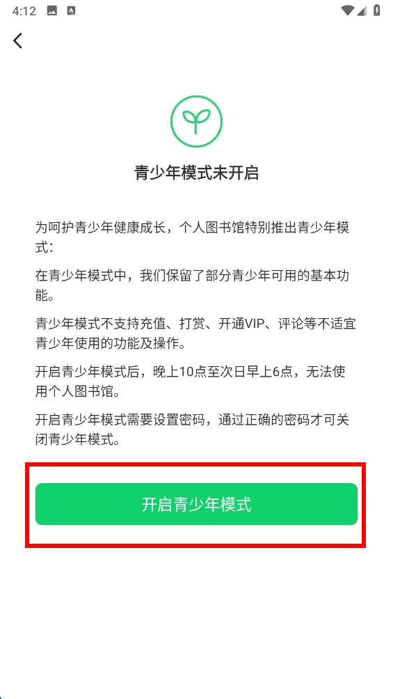 4、在青少年模式界面,點擊開啟青少年模式按鈕,按照提示設(shè)置密碼等操作,即可成功開啟。
