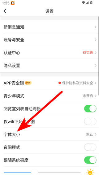 3、在設(shè)置頁面,點擊字體大小選項,進(jìn)入字體大小設(shè)置界面。