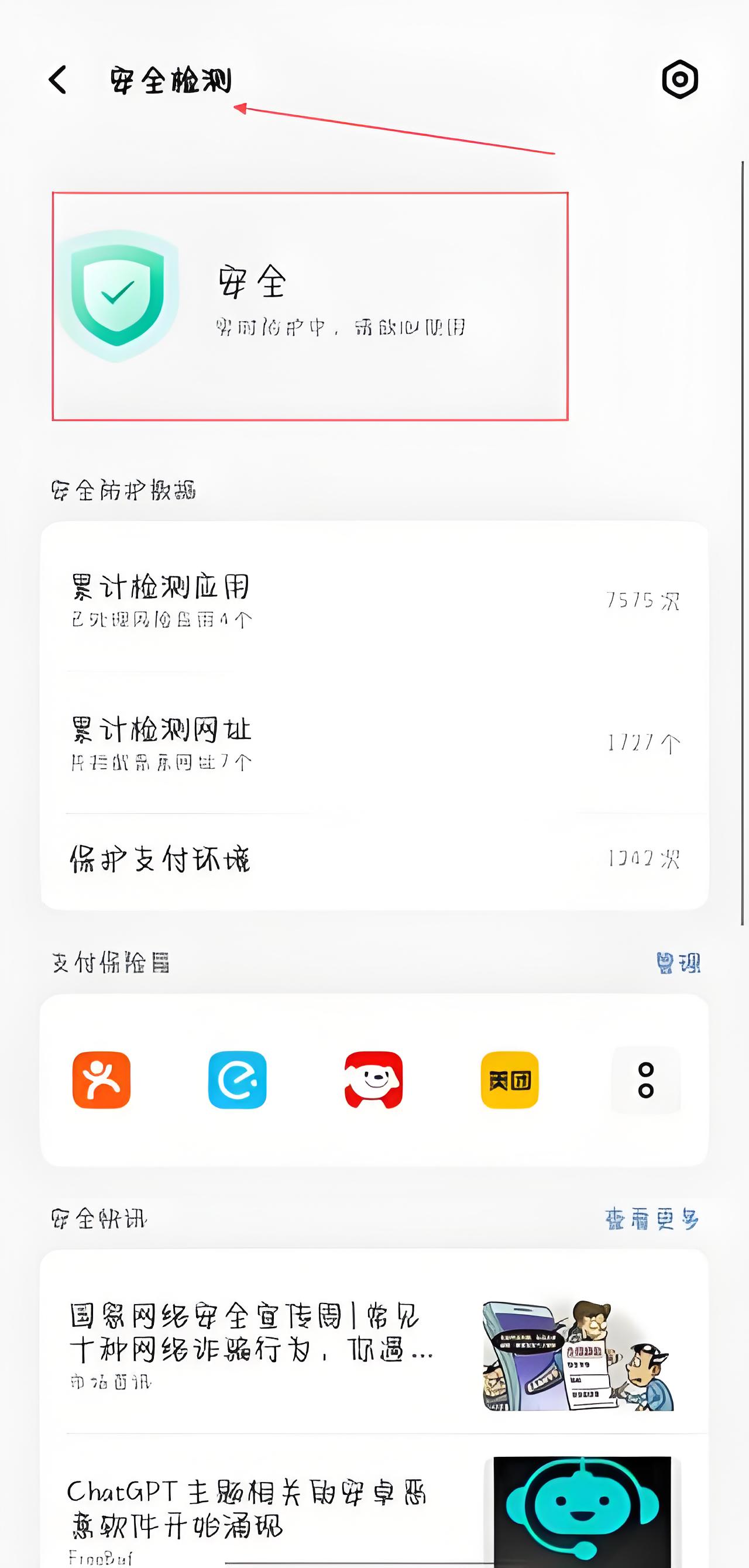 2、點擊安全檢測選項,進入安全檢測頁面,軟件自動開始檢測手機安全狀態(tài),完成后查看顯示結(jié)果,了解累計檢測應(yīng)用次數(shù)、累計檢測網(wǎng)址數(shù)量等數(shù)據(jù),確認(rèn)手機安全防護情況。