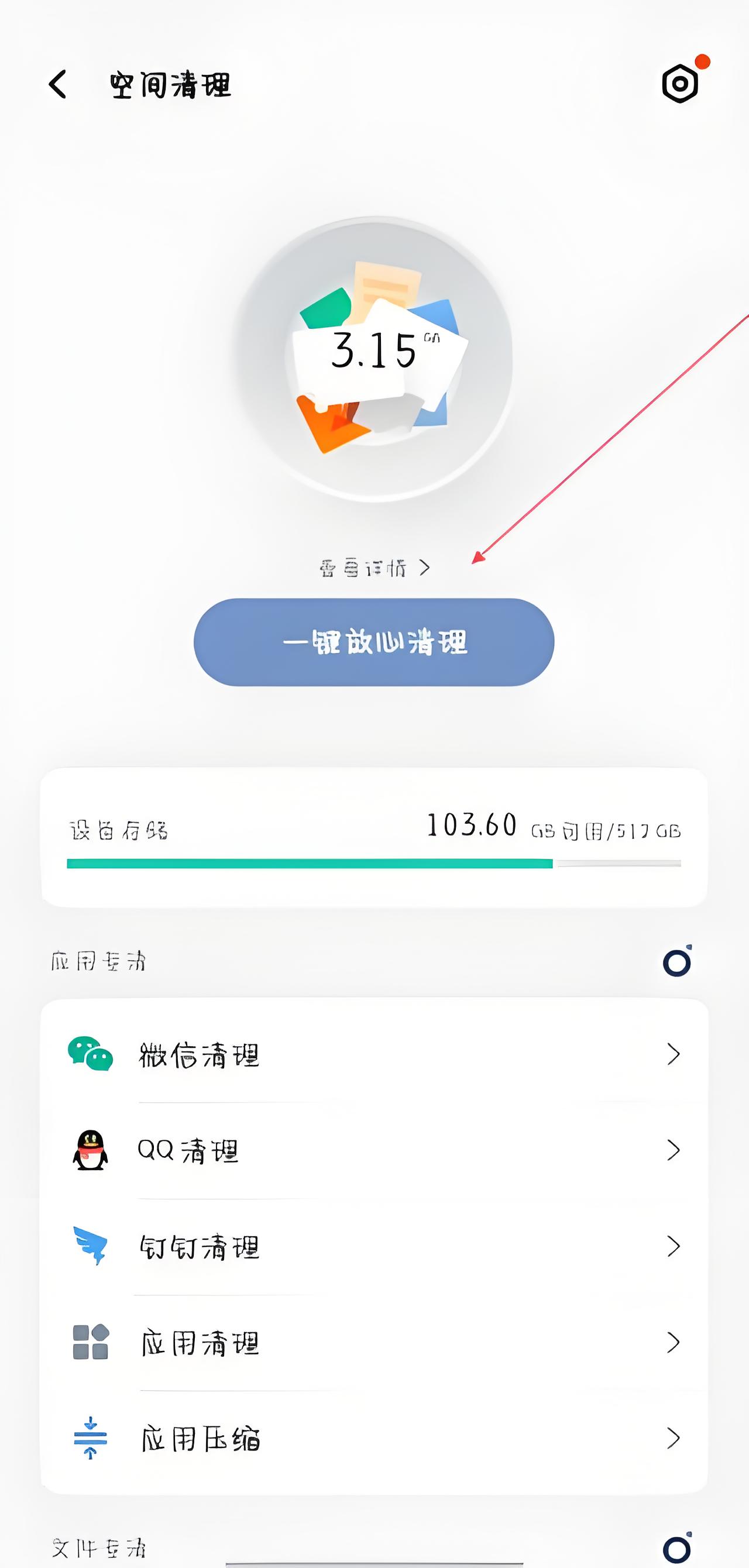 3、點擊空間清理選項,軟件會掃描手機可清理空間,顯示垃圾總量,點擊一鍵放心清理可快速處理常規(guī)垃圾,若想深入清理,點擊查看詳情,可針對微信QQ等應(yīng)用進行專項清理。