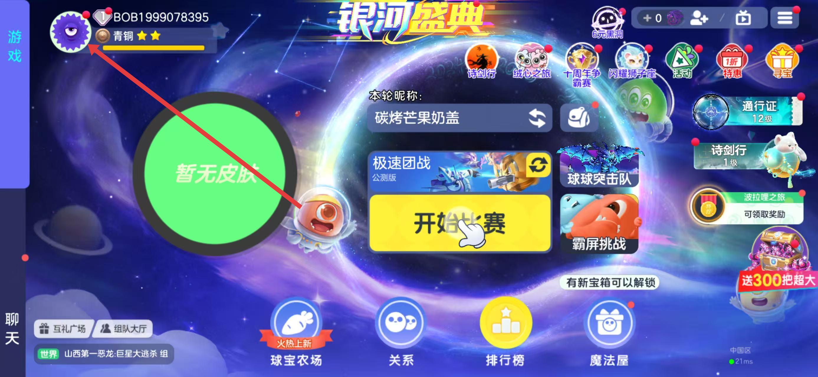 1、進(jìn)入球球大作戰(zhàn)游戲主界面,點(diǎn)擊左上角帶有紫色齒輪標(biāo)志的頭像,進(jìn)入個(gè)人信息頁(yè)面。