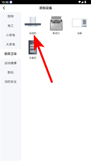 3、在設(shè)備分類界面,選擇要添加的設(shè)備類別,如廚房衛(wèi)浴,再選擇具體設(shè)備,如油煙機(jī)。