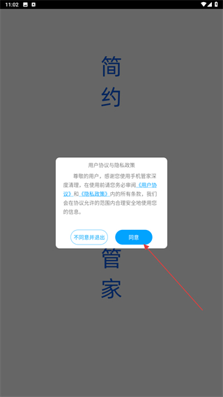 1、打開手機(jī)管家深度清理APP,進(jìn)入時會彈出用戶協(xié)議與隱私政策,點擊同意的按鈕。