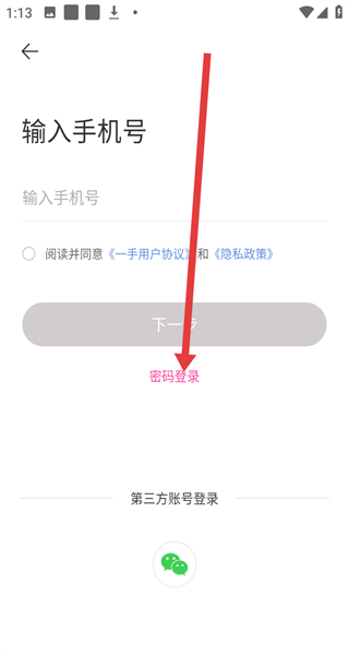 3、在進(jìn)入到手機(jī)號(hào)登錄頁面中,可以繼續(xù)點(diǎn)擊密碼登錄按鈕,切換為密碼方式登錄。
