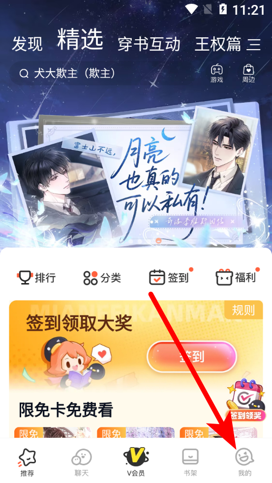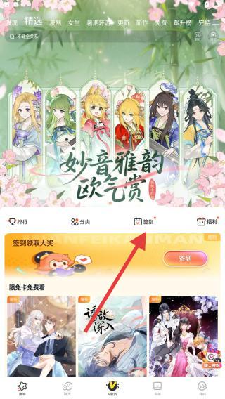 2、進(jìn)入到精選頁面的內(nèi)容中,可以先進(jìn)行簽到來領(lǐng)取簽到獎勵,也可以點(diǎn)擊想看的漫畫進(jìn)行瀏覽閱讀。