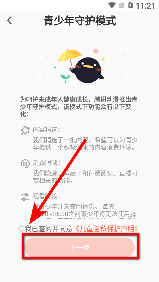 3、在青少年守護(hù)模式頁面,勾選我已查閱并同意后點(diǎn)擊下一步。
