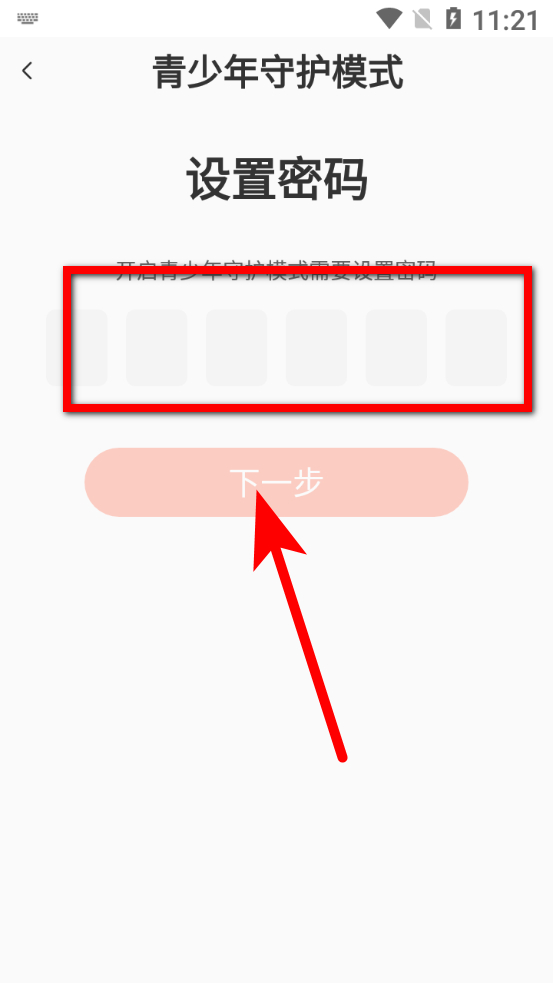4、在設(shè)置密碼頁面,設(shè)置密碼后點(diǎn)擊下一步,即可開啟青少年模式。