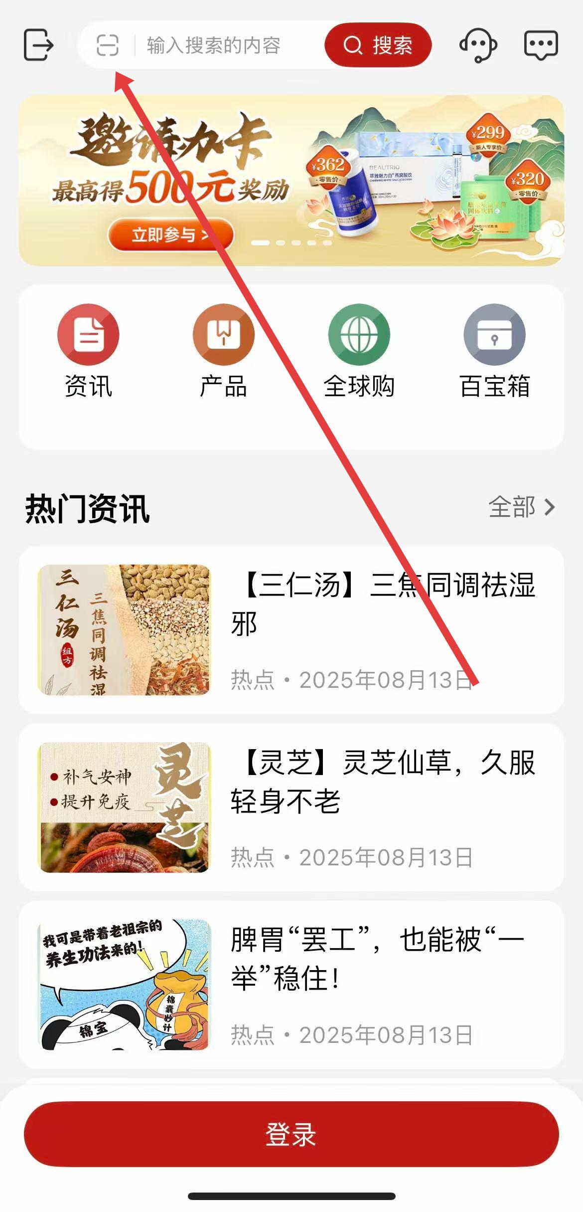 1、打開無限極APP,進入首頁后,點擊頂部的掃一掃圖標,掃一掃位置在搜索欄頂端的左側(cè)。