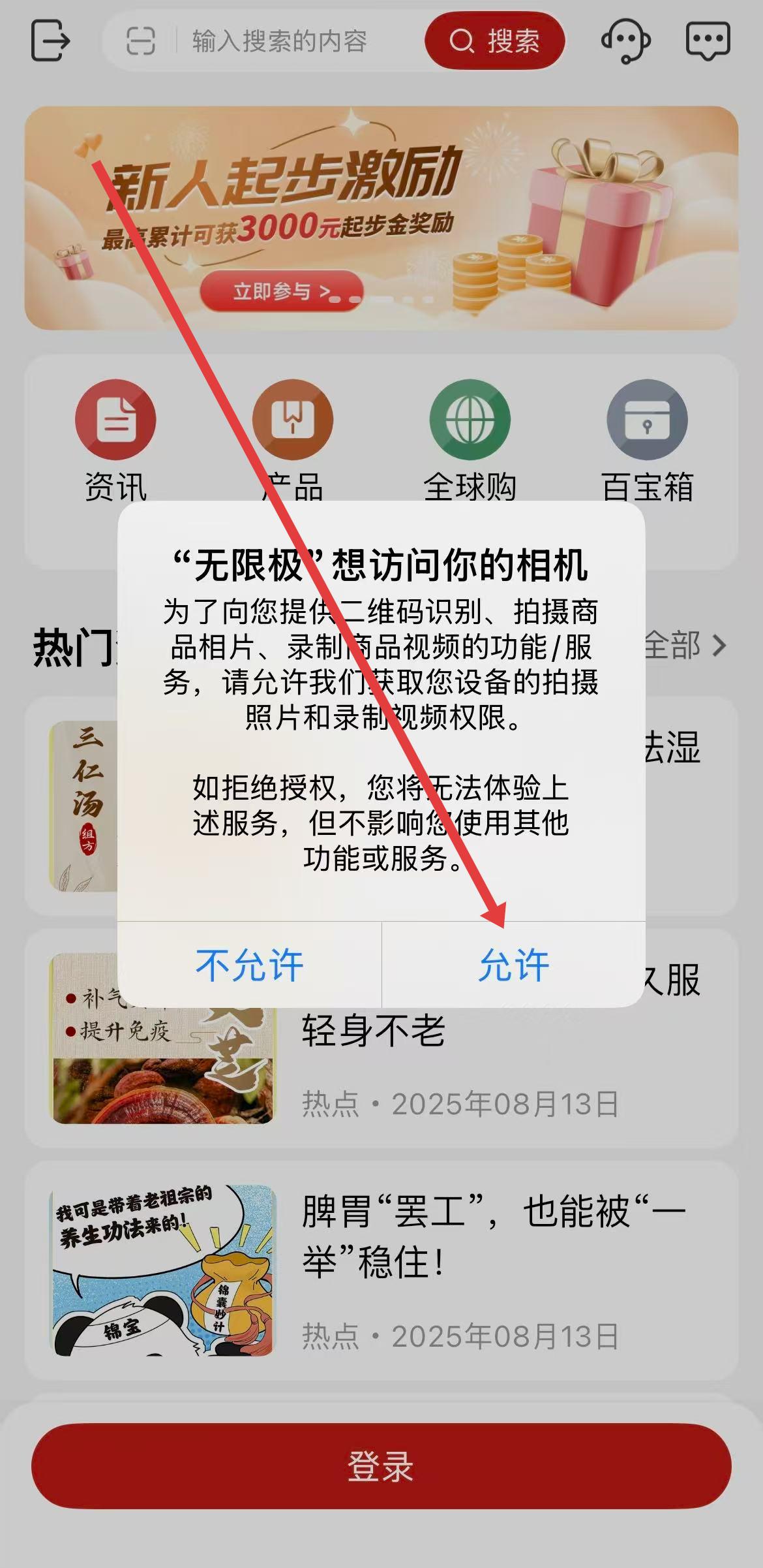 2、此時APP會彈出權(quán)限申請?zhí)崾究颍儐柺欠裨试S訪問相機,點擊允許,授予APP相機使用權(quán)限,若之前已授權(quán),可跳過此步。