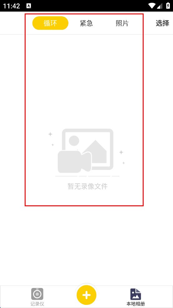4、成功連接后,進入文件查看界面,可在“循環(huán)”“緊急”“照片”等分類下查看對應(yīng)的錄像或照片文件,此時若還未錄制,會顯示“暫無錄像文件”。