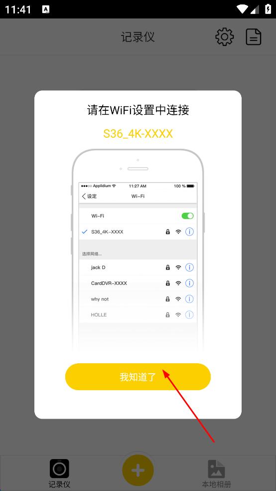 3、點擊后會彈出“請在WiFi設(shè)置中連接S36_4K-XXXX”的提示框,明確連接所需的WiFi網(wǎng)絡(luò),然后點擊“我知道了”按鈕,去手機WiFi設(shè)置中進行連接。