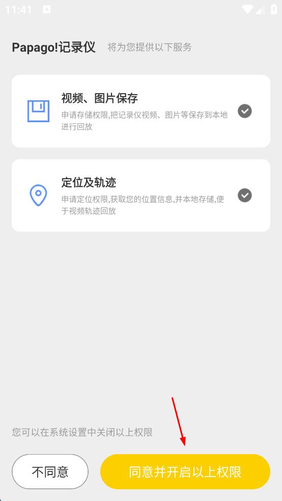 1、打開Papago!記錄儀應(yīng)用,會看到服務(wù)權(quán)限提示頁面,顯示“視頻、圖片保存”和“定位及軌跡”兩項服務(wù),若同意開啟這些權(quán)限,點擊“同意并開啟以上權(quán)限”按鈕。