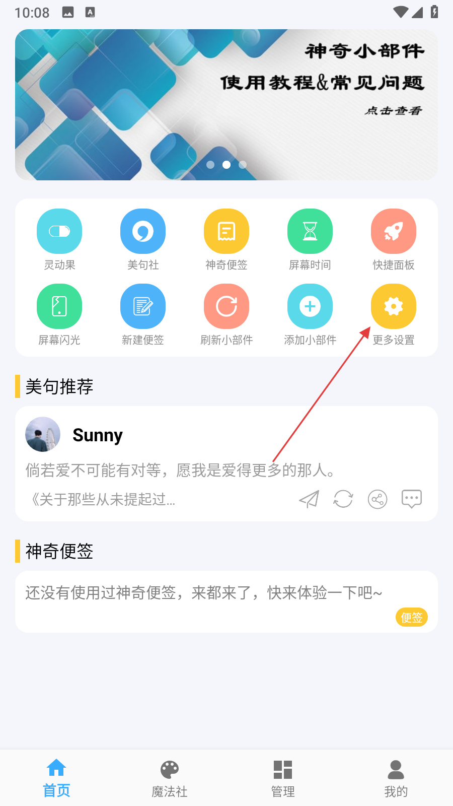 1、打開神奇小部件應用,在首頁點擊更多設置選項,進入更多設置頁面。
