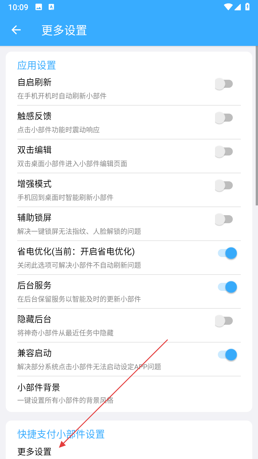 2、在更多設置頁面中,找到并點擊快捷支付小部件設置下的更多設置。