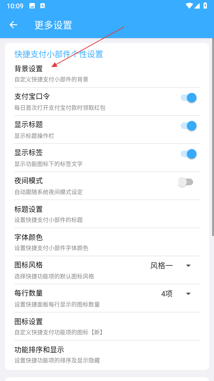 3、在快捷支付小部件個性設置頁面,點擊背景設置選項,進入選擇背景頁面。