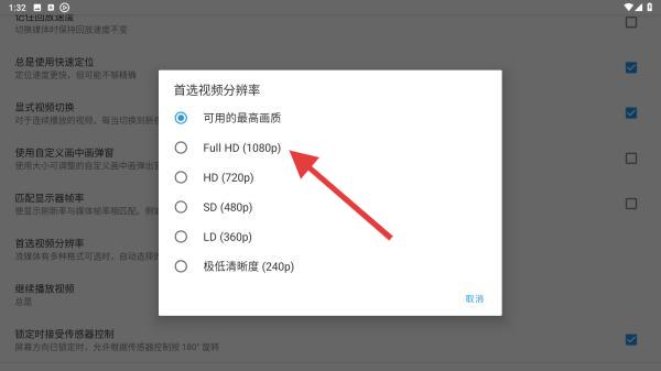 3、點擊首選視頻分辨率或類似名稱,如畫面質(zhì)量,彈出選項點擊最高的即可。